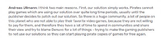 “盗版玩家在很长一段时间内都无法游玩搭载了D加密方案的游戏,通常直到发行商决定移除我们的解决方案为止。”