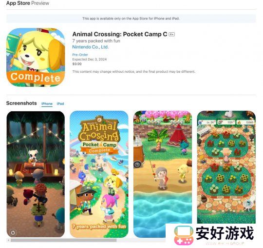近日任天堂正式公布了买断制《动物森友会:口袋露营广场集合版》的上线时间,将于2024年12月3日登录iOS和安卓平台,目前已在双端的商城页面上线,并提供事前登录和预定,目前预定价格为9.99美元(iOS端,约合人民币71.3元)。