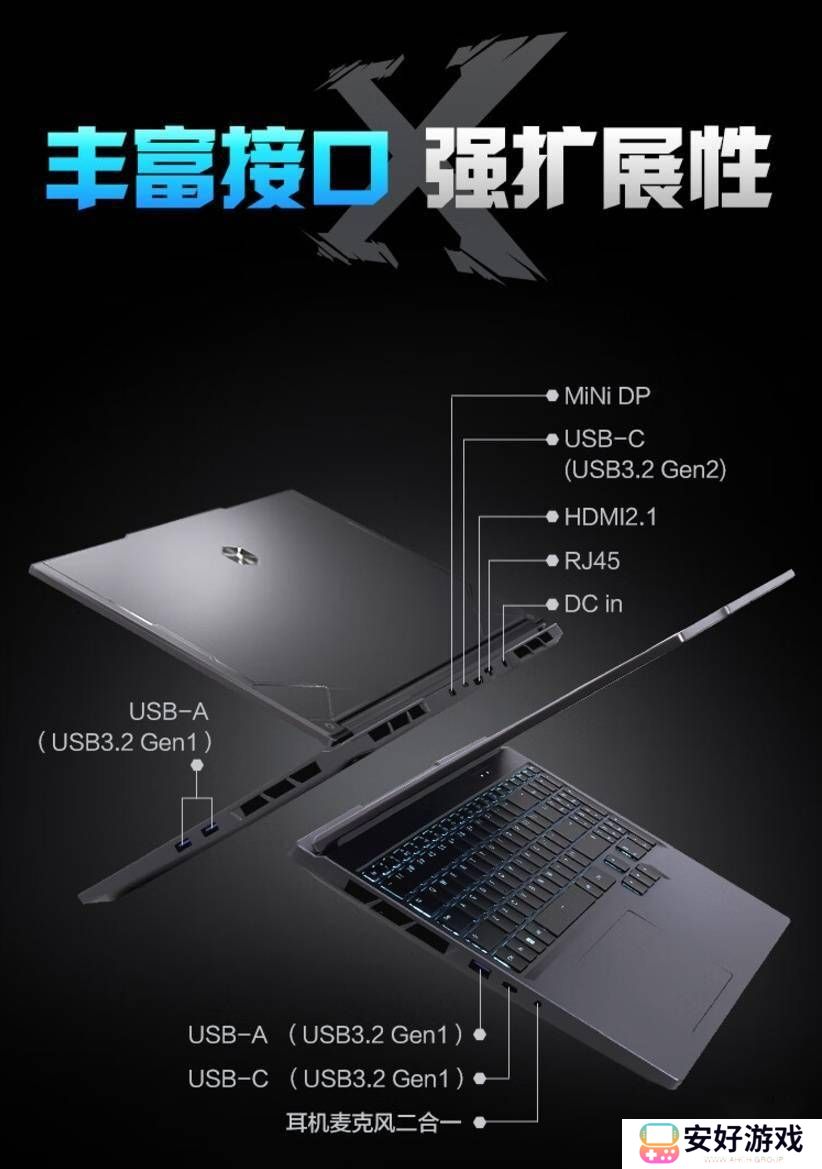 接口方面,极光X游戏本配备了丰富的接口选项,包括2个USB-A 3.2 Gen 1接口、1个USB-C 3.2 Gen 1接口、1个USB-C 3.2 Gen2接口、1个Mini-DP接口、1个HDMI 2.1接口、1个RJ45接口、1个DC in接口以及1个耳机麦克风二合一接口,满足用户多样化的连接需求。