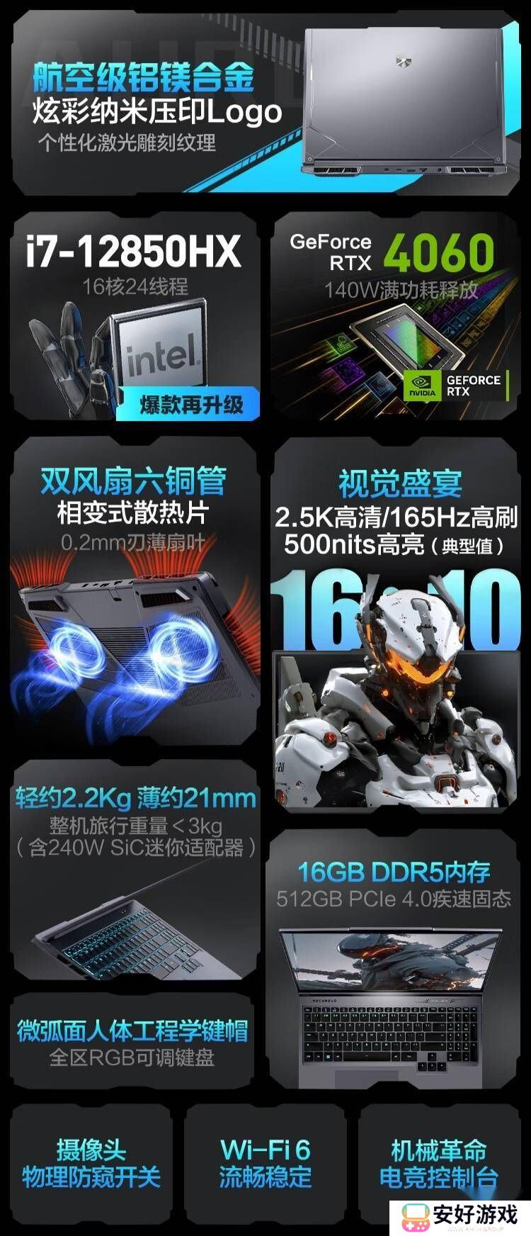 新配置的机械革命极光X游戏本采用英特尔酷睿i7-12850HX处理器,拥有16核心24线程,配合140W功率的RTX4060显卡,支持双显三模输出,确保游戏流畅运行。散热方面,笔记本配备了双风扇六铜管设计,采用0.2mm刃薄扇叶,有效提升散热效率。