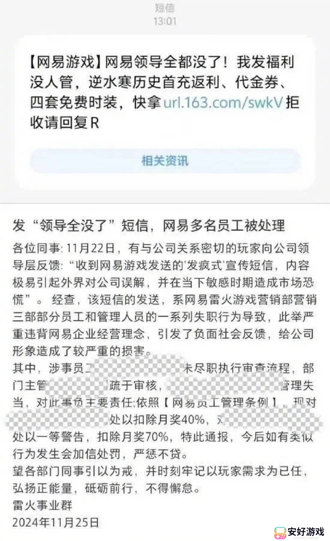 面对这一事件,网易雷火事业群迅速作出了回应。他们发布了一份通报,称已经对涉事的员工进行了扣钱和警告的处罚。通报中明确指出,这则短信的发送是营销三部部分员工和管理人员的一系列失职行为所导致的。这一行为不仅严重违背了网易企业的经营理念,更在社会上引发了负面的反馈,对公司形象造成了较为严重的损害。