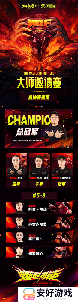 虽然2024《地下城与勇士:起源》大师邀请赛已落下帷幕,但热血澎湃的格斗仍将延续,勇士们可以关注“地下城与勇士手游”、“地下城与勇士手游赛事”官方账号,获取地下城与勇士手游赛事最新动态。
