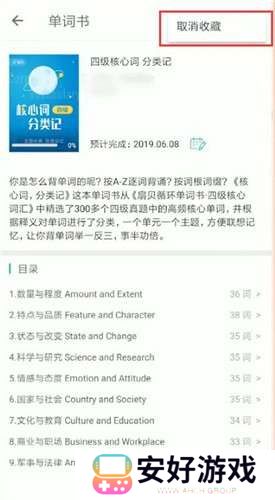 打开扇贝单词APP,进入“我的”页面,选择“单词书”,在单词书页面中点击右上角的三个点或类似设置图标,然后选择“取消收藏”选项,确认后即可成功取消对该单词书的收藏。这样,用户就可以轻松管理自己的单词书列表,专注于当前的学习任务。