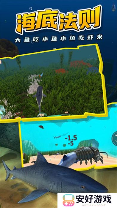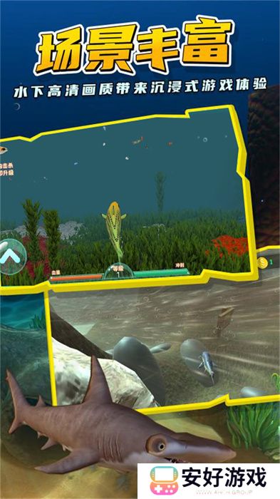 3. 成长与进化系统:玩家可以通过吞噬不同种类的海洋生物来积累经验值,提升巨鲨的等级和能力,解锁更强大的技能和装备。