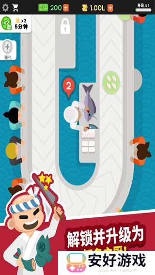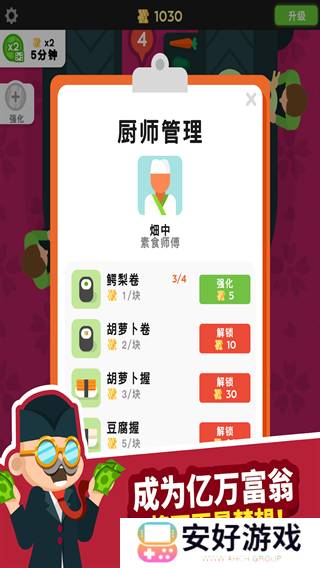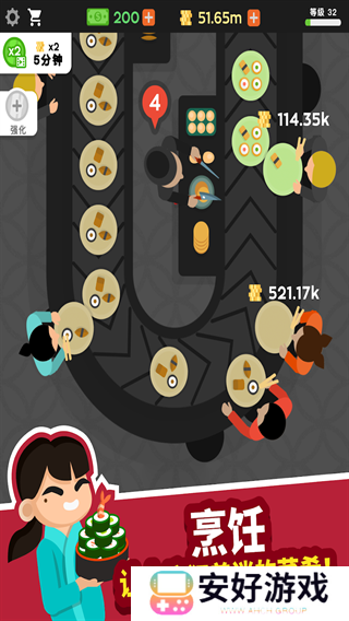 1. 放置经营:游戏采用放置玩法,玩家只需设定好厨师和服务员的工作内容,他们就会自动进行寿司制作和顾客服务。玩家可以适时调整策略,优化经营流程。