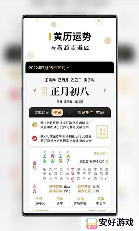 依托权威的《钦定协纪辩方书》等传统历法经典,提供每日宜忌、吉神、凶神、五行、冲煞、值神、四神位、建除十二日、二十八星宿、胎神、彭祖百忌、时辰吉凶等信息。