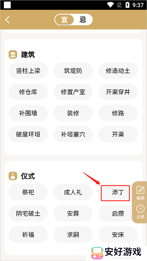 2、选择“宜”中选择“仪式”里面的“添丁”。