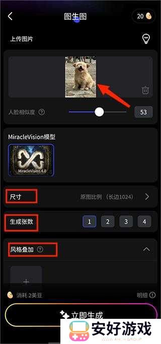 2、进入后点击上传图片然后选择图片相关选择,如人脸相似度、风格叠加还有对于画面风格的要求的提示词;