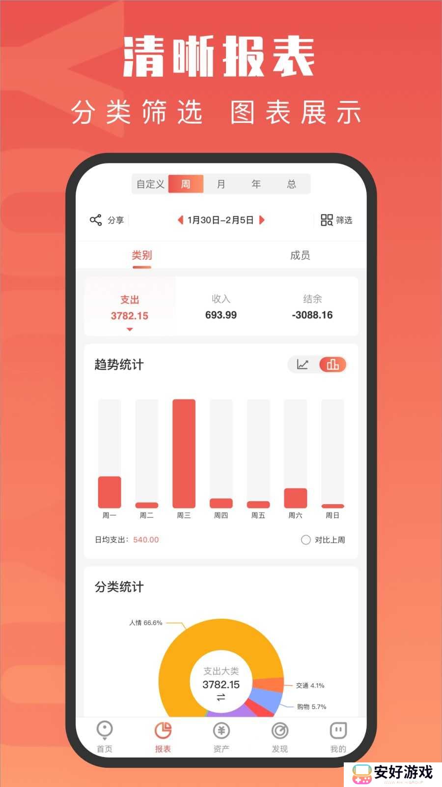 - 图表账单展示,趋势图显示日均花费,饼状图分析收支构成