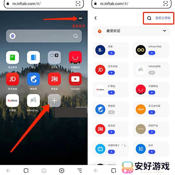 打开狐猴浏览器,就能看到它简洁的UI设计,就是大家很熟悉的 Infinity 标签页,登录Infinity账号,可以同步PC端数据;标签页也支持自定义添加。