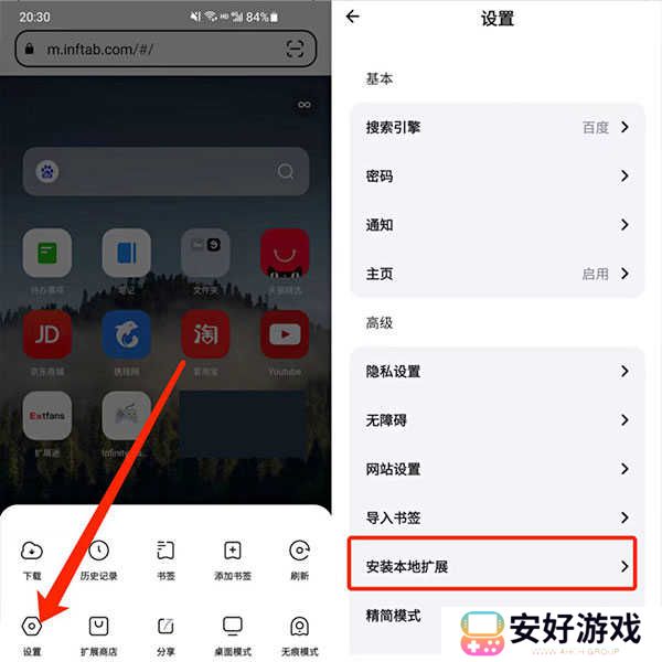 或者直接导入本地插件就比较简单,就在软件设置的「安装本地扩展」。可以导入手机文件里有的扩展插件或者别处下载的,只要保存到手机都可以安装。