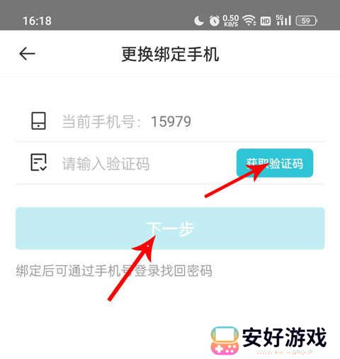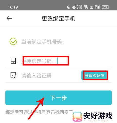 5、最后在输入需要绑定的新的手机号,然后在获取验证码,点击下一步就成功换绑了。