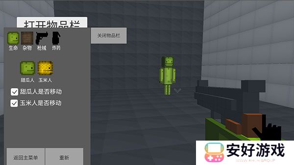 3、进入地图后,点击打开物品栏,玩家可以添加甜瓜人、玉米人、桌子,以及装备手枪、放置炸药等。
