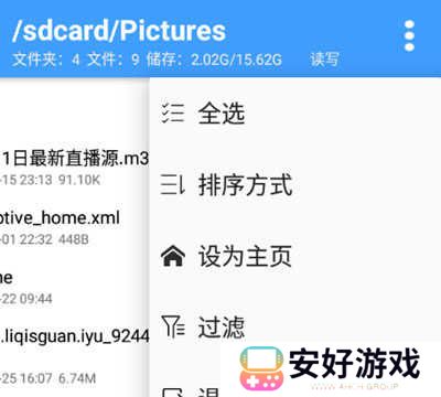 4、点击右上角的三个点可以弹出更多的功能按键,提供搜索、全选、排序、隐藏文件显示等功能。