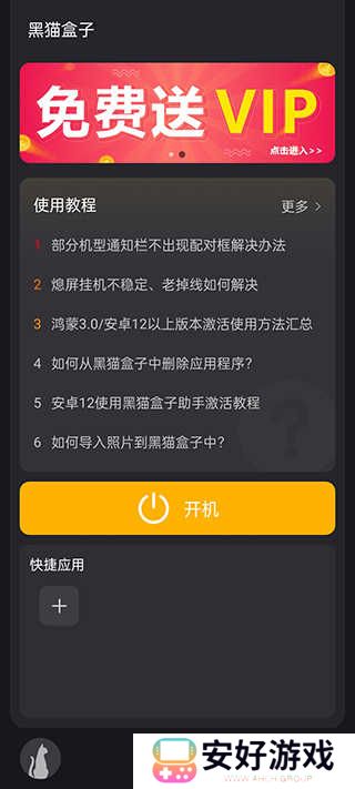 1、首先打开黑猫盒子app,点击开机