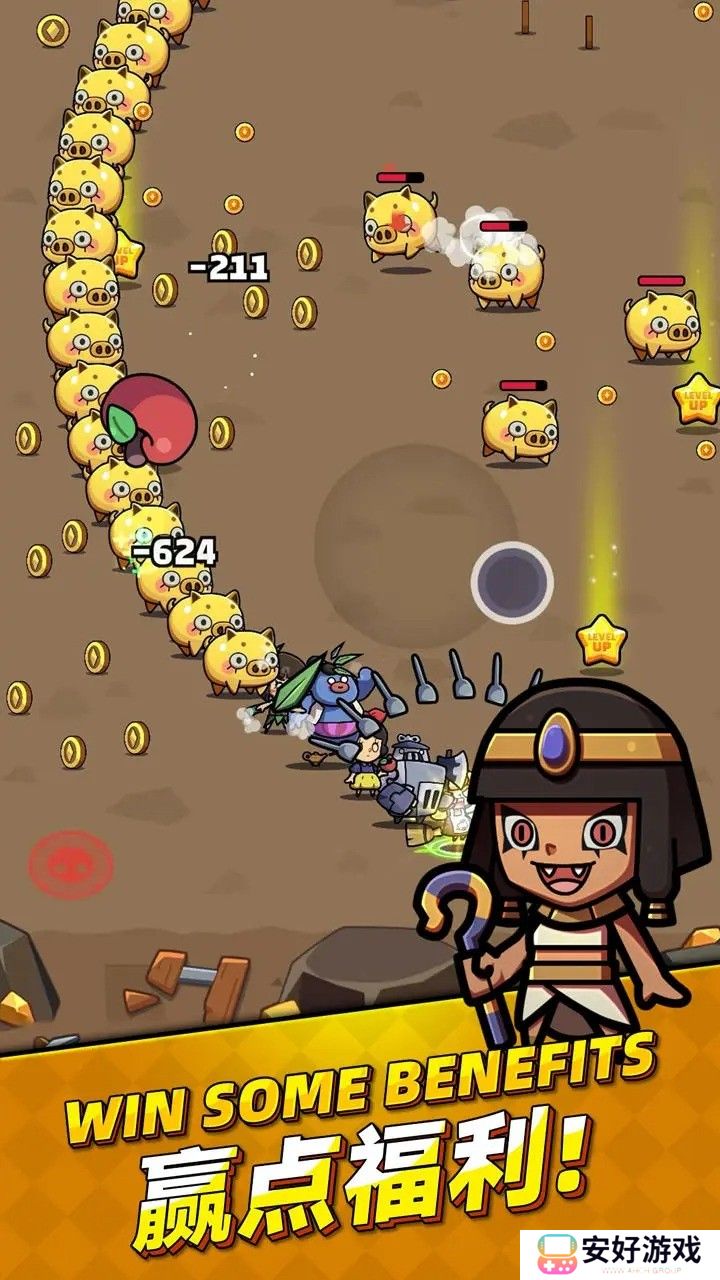 在游戏闯关的过程中玩家需要通过:滑动摇杆,操作角色移动到指定位置,点击攻击按键消灭敌人靠近奖励可以自动收取,每一次消灭敌人都会积累宝贵的战斗经验,让经验条不断增长,靠近箱子自动开启,当等级进度条满格时,就可以选择奖励了。