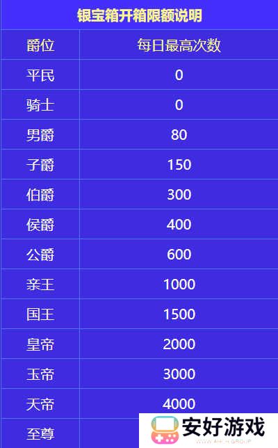 宝箱作为平台活跃道具,为避免用户过度开箱,平台对各爵位银宝箱的开箱次数做了一定限制