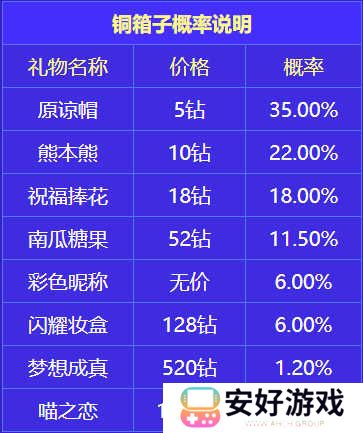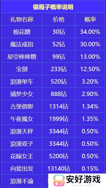 宝箱爆率期间,银宝箱中52钻、99钻、128钻、520钻礼物对比非活动期间提升20%,1314钻礼物对比非活动期间提升100%,其他礼物按比例下降;