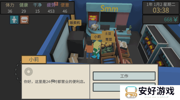 去超市兼职(虽然不赚钱,但是要的是工作值)把时间调到最大,然后去长椅休息4个小时,让后去超市贩卖机买包薯条继续兼职(自己计算好便意值和干净值便意值到一百时马上释放干净值为0时去水龙头处清洗)完了以后在长凳上休息8个小时。