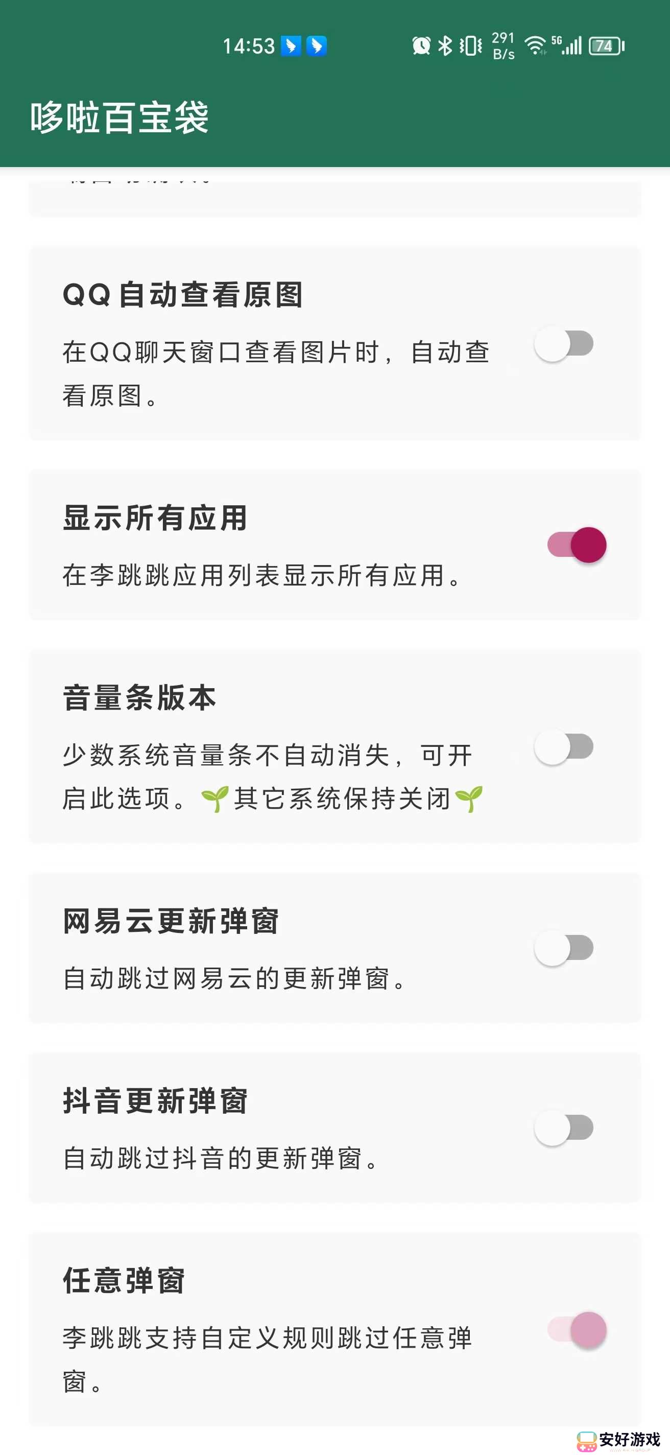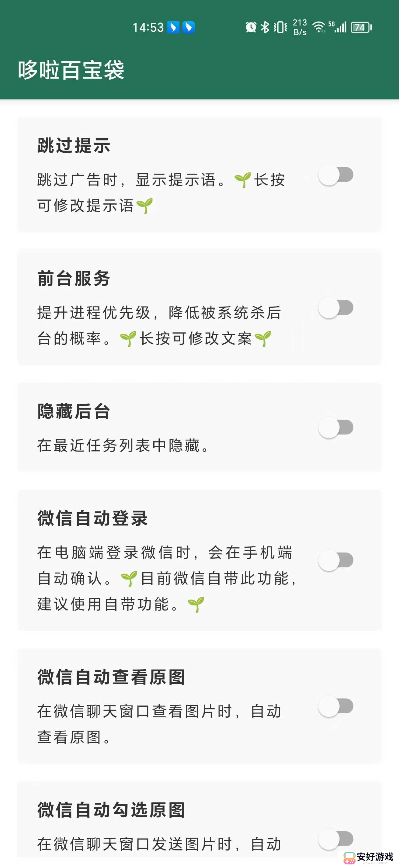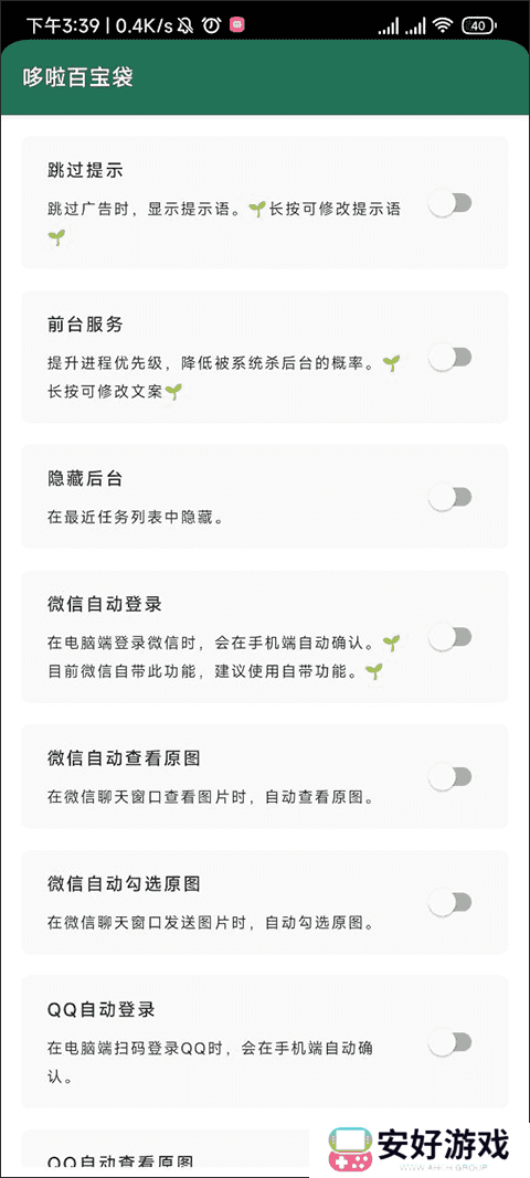 在这个哆啦百宝箱内我们可以设置跳过提示、前台服务、qq自动登录等等的功能,我们只需要把功能后面的开关打开就可以了。