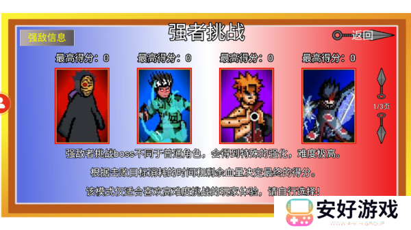当你进入开始游戏时,又有很多的选择,强者挑战、无尽试炼、演练、忍术对战。