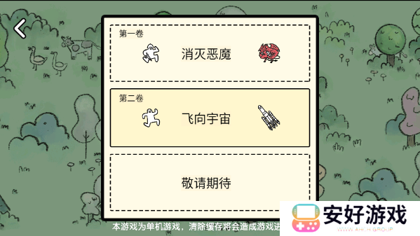 2、点击开始游戏后,我们可选择俩个剧情进行体验,第一卷“消灭恶魔”第二卷“飞向宇宙”的游戏难度皆相同,不过剧情任务有所区别