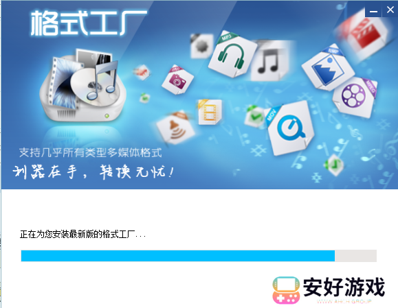 3.你点击一键安装选项后,格式工厂软件就开始安装了,如下图所示,你只需要等待安装进度条完成就可以进入下一个界面,安装速度是很快的,耐心等待即可。