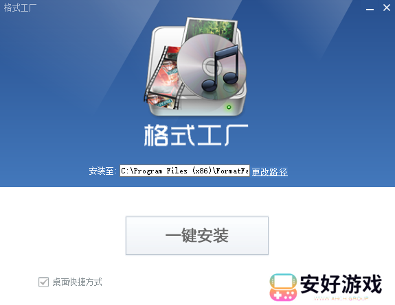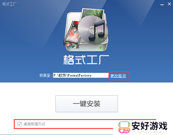 2.你有两种方式来安装格式工厂软件,你可以直接点击一键安装选项,软件会默认安装到系统C盘中,或者点击界面中的更改路径选项,然后在弹出的选项框中选择合适的安装位置,选择完成后在界面下方还有附加的桌面快捷方式和添加快捷启动栏两个选项,这个可以方便用户快速的找到并打开软件,建议你保留,最后再点击一键安装选项。(C盘为系统盘,软件过多会导致电脑运行变慢,所以软件一般选择其他盘进行安装。)