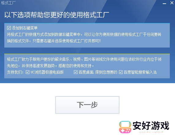 4.格式工厂软件安装进度条完成后,进入下图中的界面,在界面中有添加到右键菜单选项,可以方便用户快速代开软件进行使用,在界面下方还有附加的下载选项,你如果不需要的话可以取消勾选,然后点击界面下方的下一步。
