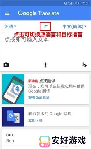 4、当然,如果你想根据中文来查对应的英文单词,谷歌翻译也是可以做到的,只需要点击中间的互换图标,将源语言与目标语言对调即可。