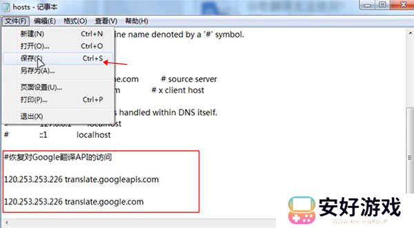 然后可以使用记事本或者文本编辑器打开系统hosts文件,上面有介绍文件地址在哪,然后在文件里输入以下文字,并保存: