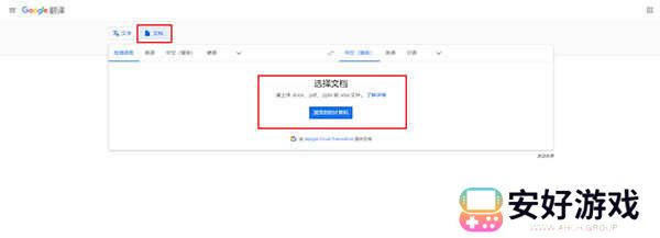 打开谷歌翻译在线工具之后,进入的是文本翻译界面,翻译文的话直接点击文档按钮,就可以进入文档翻译界面了。