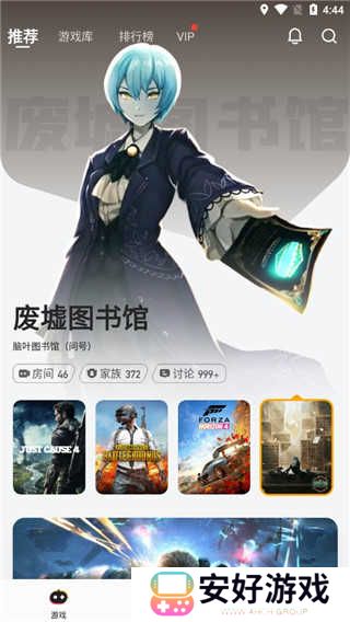 2、游戏页面,推荐热门的游戏或者是新出的游戏,游戏库拥有很多类型的游戏,还可以查看你的游戏榜单、VIP服务等;