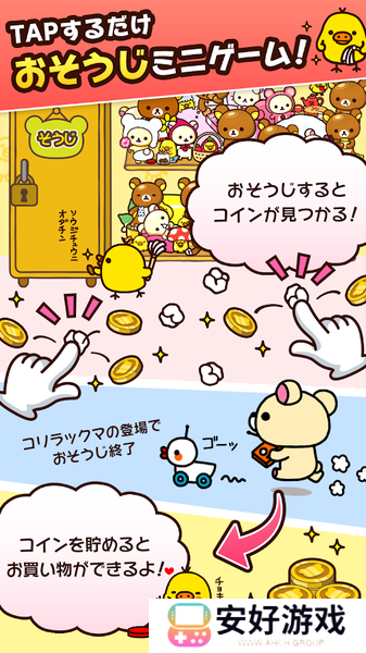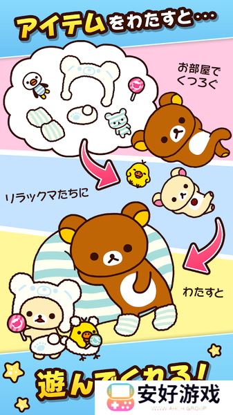 3. 互动玩法:玩家可以与轻松熊们进行各种互动,如一起玩耍、打扫房间、恶作剧等,每个互动都会增加你们之间的好感度。同时,玩家还可以给轻松熊们穿上不同的道具,让他们变化模样,增加游戏的趣味性。