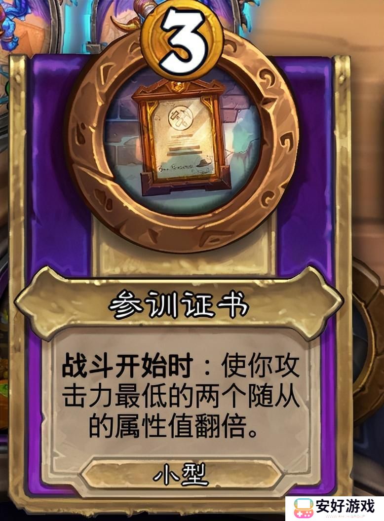 整个体系的key牌,只有在小饰品环节选到参训证书才能玩这个流派!效果是在战斗开始时让队伍攻击力最低的两个随从身材翻倍,搭配泰蕾苟萨保留效果,就可以实现每轮翻番的效果。记得场上只放两个随从,不浪费任何一个回合。