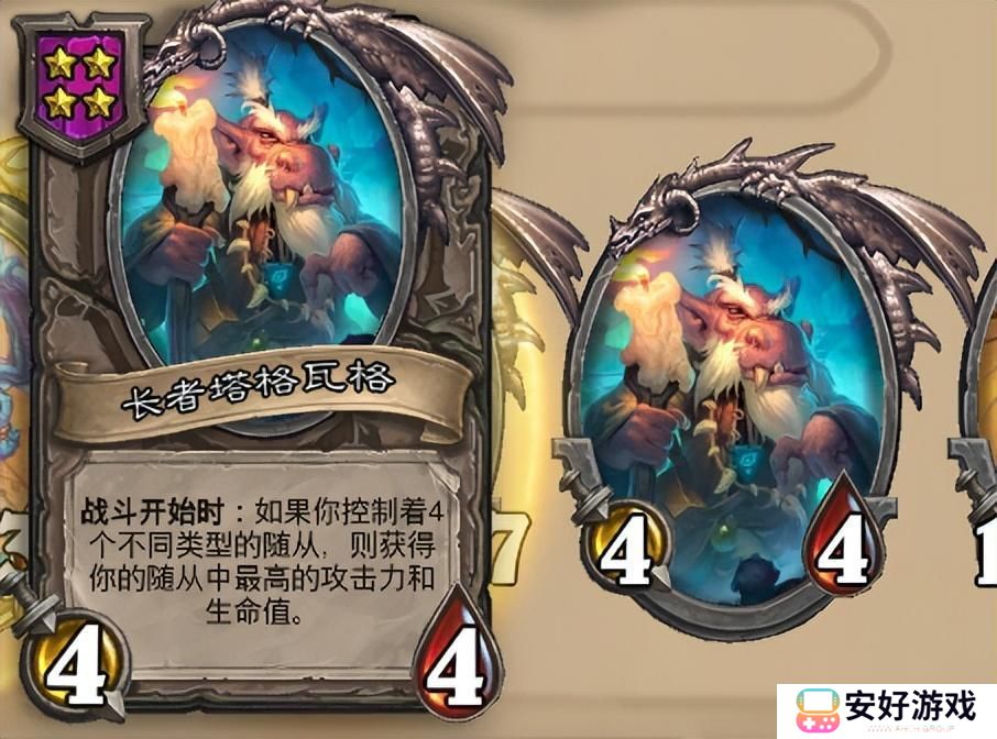 长者塔格瓦格是四本的伙伴卡,需要通过法术发现,效果是场上有四个不同类型的随从,就会获得随从中最高攻击力和生命值的身材,在5000分以上绝大多数玩家都会针对我们这套翻倍体系,毕竟核心战力就两张泰蕾,两张火车王就能完美应对,另外还有剧毒以及城管等。