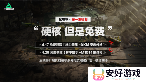 第一重福利,在4月17日和4月29日登录游戏完成简单任务,即可免费领取AKM和M1014的林中猎手系列外观。