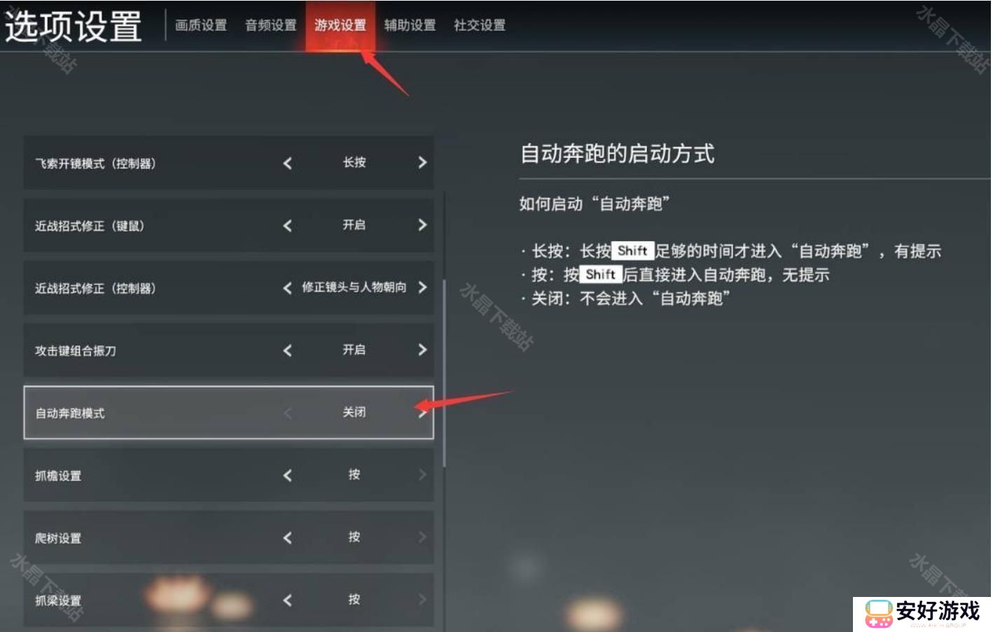 4、最后向下拉找到【自动奔跑模式】,打开即可。