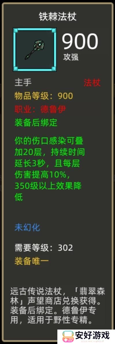 装备效果:你的伤口感染可叠加20层,持续时间延长3秒,且每层伤害提高10%,350级以上效果降低。