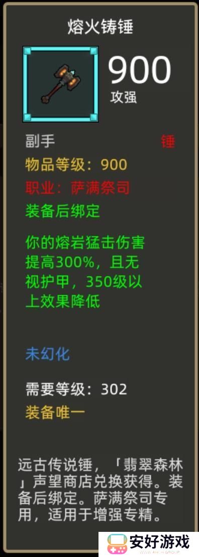 装备效果:你的熔岩猛击伤害提高300%,且无视护甲,350级以上效果降低。
