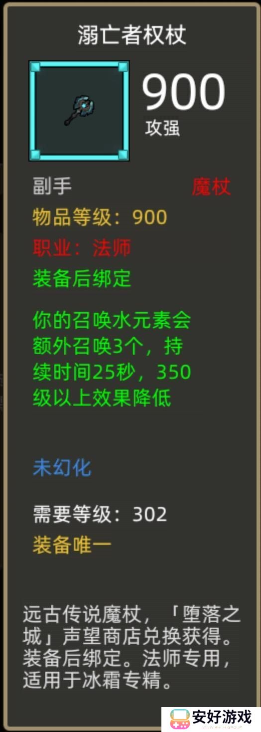 装备效果:你的召唤水元素会额外召唤3个,持续时间25秒,350级以上效果降低。