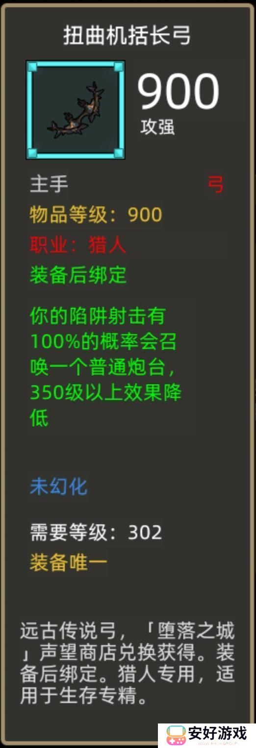 装备效果:你的陷阱射击有100%的概率会召唤一个普通炮台,350级以上效果降低。