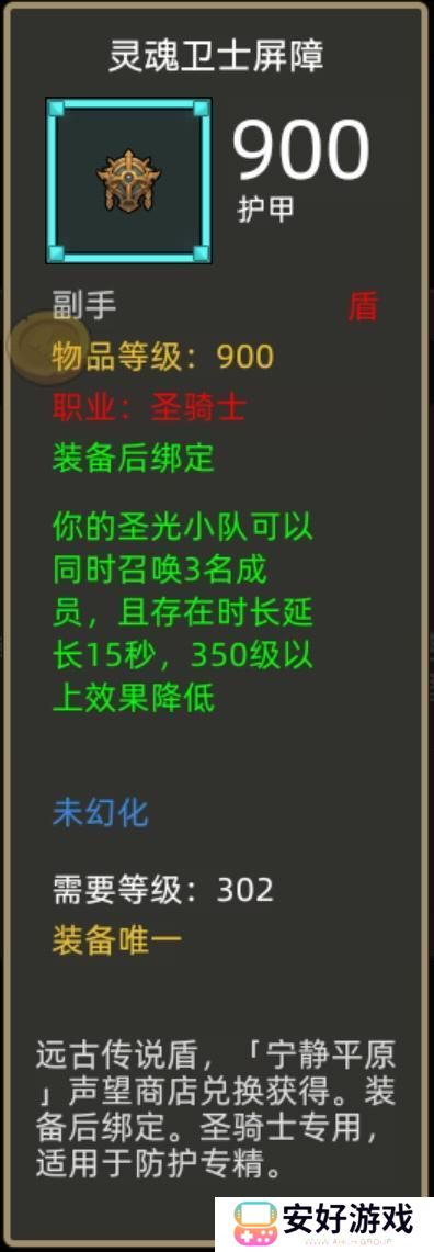 装备效果:你的圣光小队可以同时召唤3名成员,且存在时长延长15秒,350级以上效果降低。