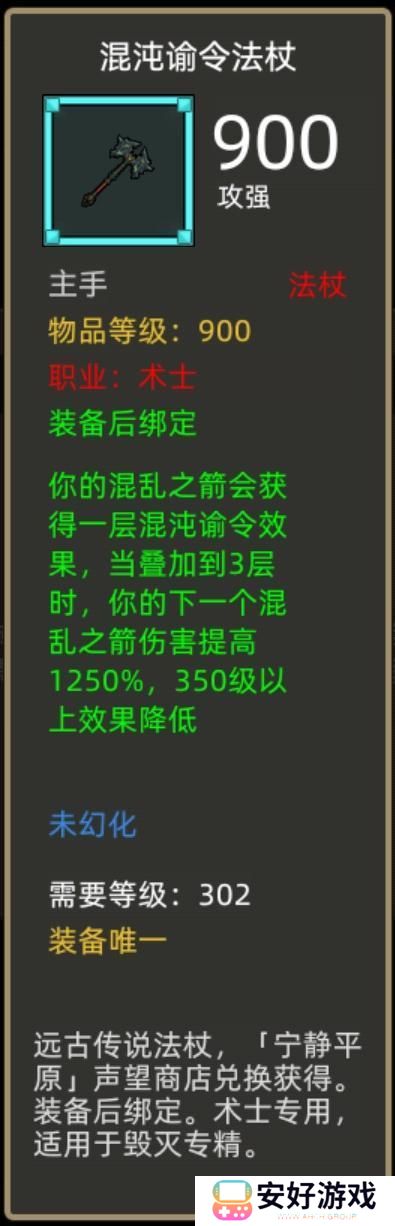 装备效果:你的混乱之箭会获得一层混沌谕令效果,当叠加到3层时,你的下一个混乱之箭伤害提高1250%,350级以上效果降低。