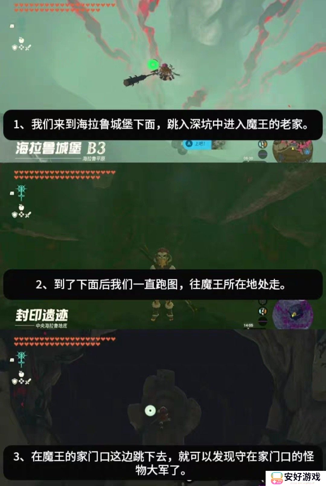 1、我们来到海拉鲁城堡下面,跳入深坑中进入魔王的老家。