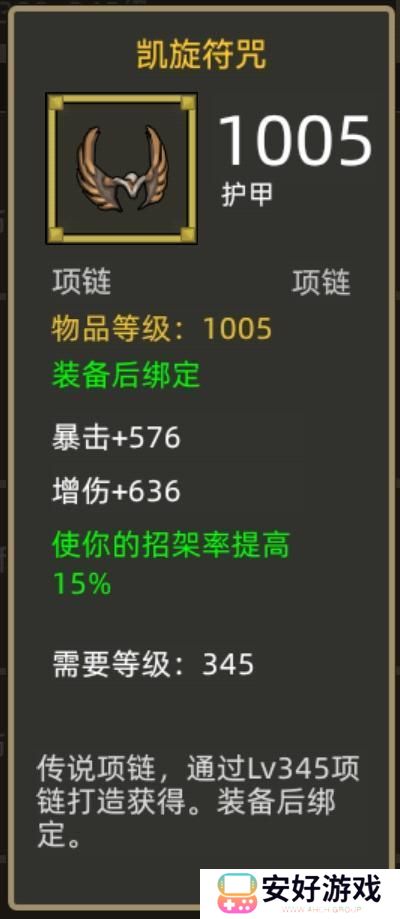 凯旋符咒是防御类职业的通用项链,自身有1005点护甲提升,还附带15%招架率提升,有了这个项链防御类职业都可以走高招架的流派。对于开荒期的小伙伴来说,是一个不错的选择,后续挂机流派小二估计也会开发满圆桌的流派。
