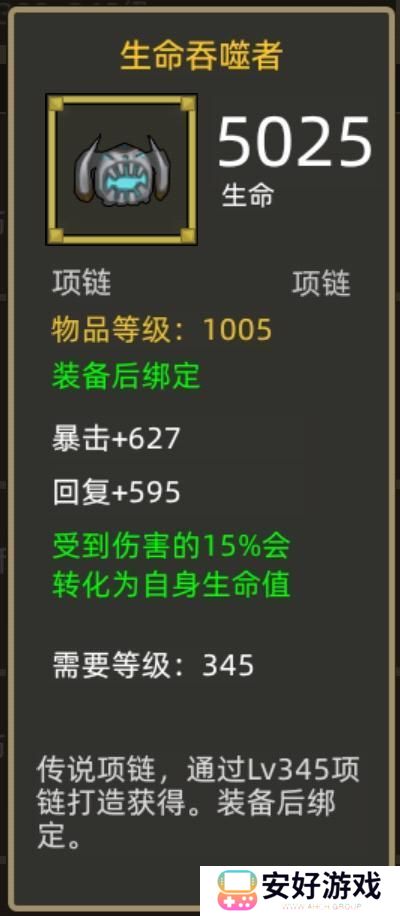 生命吞噬者这个生命项链,装备效果是受到伤害15%会转化为自身生命值。对防御类专精来说有一定的补充,但不多,还是没有血DK的再生之环还用,毕竟防御类专精像是防战,防骑来说自身受到伤害其实并不高,目前来看比较适合熊德。