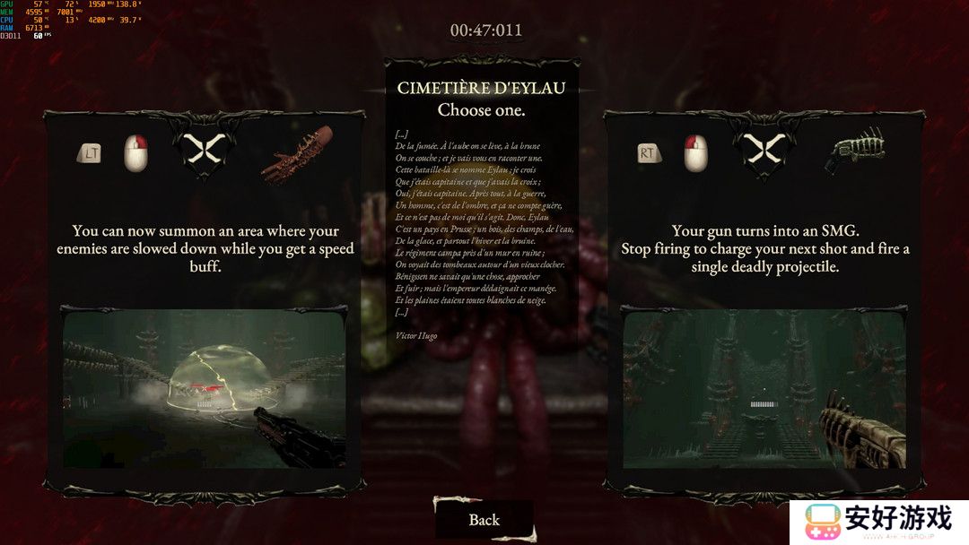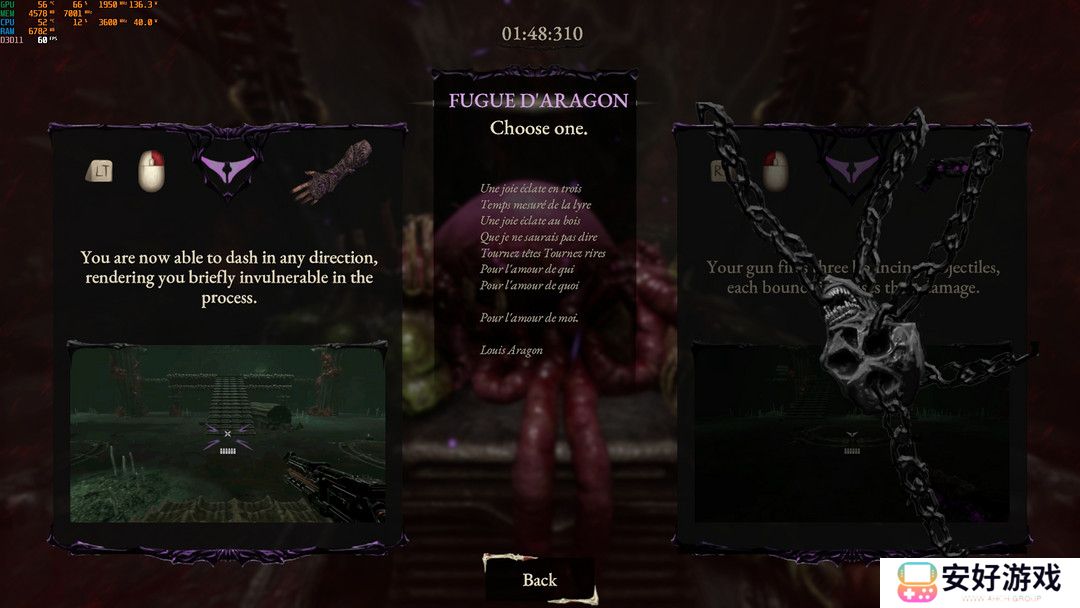 除了武器装备变异外,还有手臂变异奖励供玩家选择,手臂变异后能在远处生成一个紫色阵图,然后让角色瞬移到阵图所在的区域,有些关卡奖励需要隐藏条件才能解锁,下图只能选择左边的瞬移变异手臂。