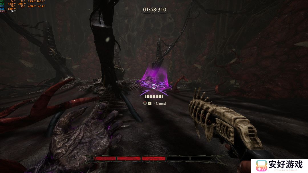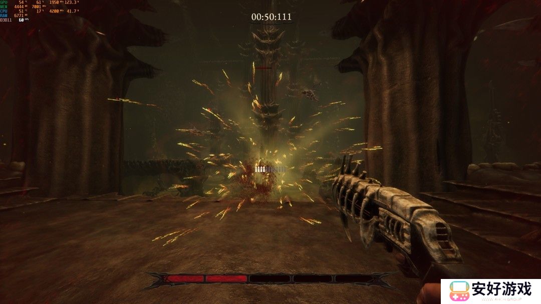 第一个场景我选了右边那个类似榴弹炮威力的武器,等它蓄力一圈后攻击基本可以一枪一群普通敌人,比默认手枪好用太多。