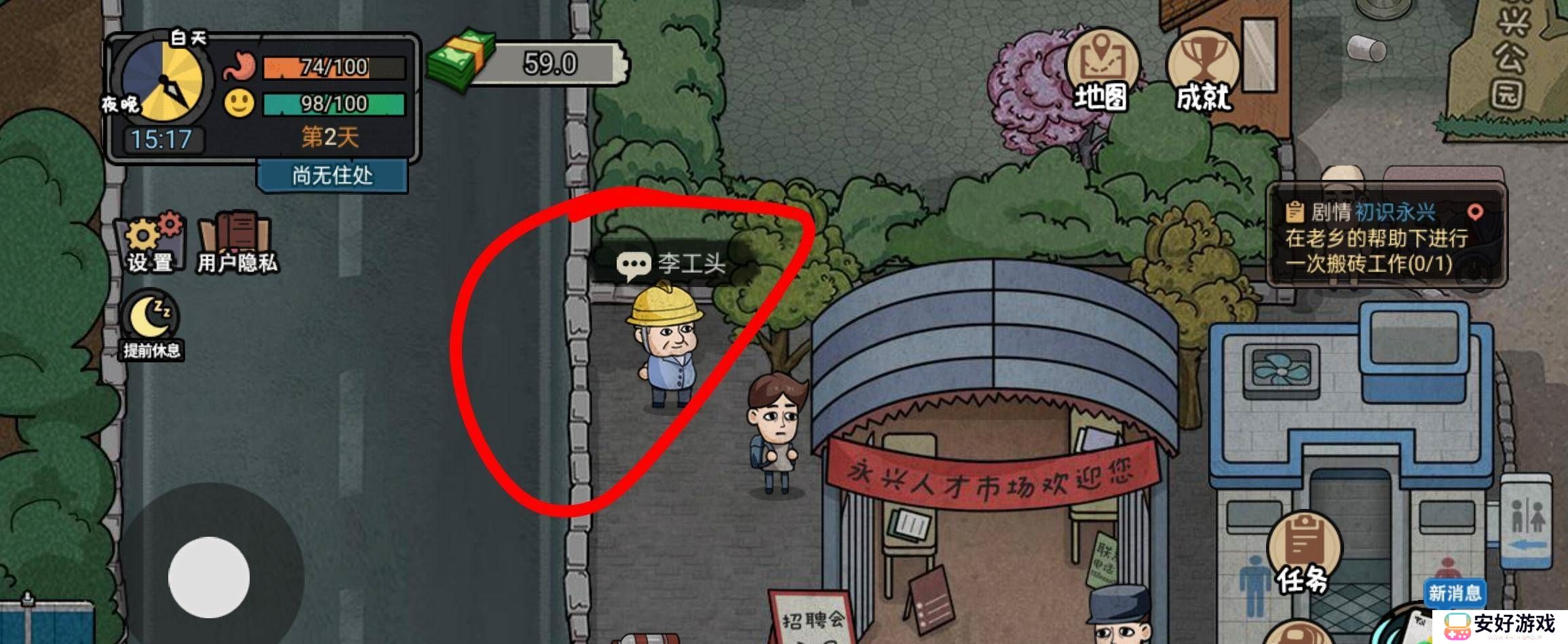 1、首先我们登录游戏,在公园附近找到并点击李工头。
